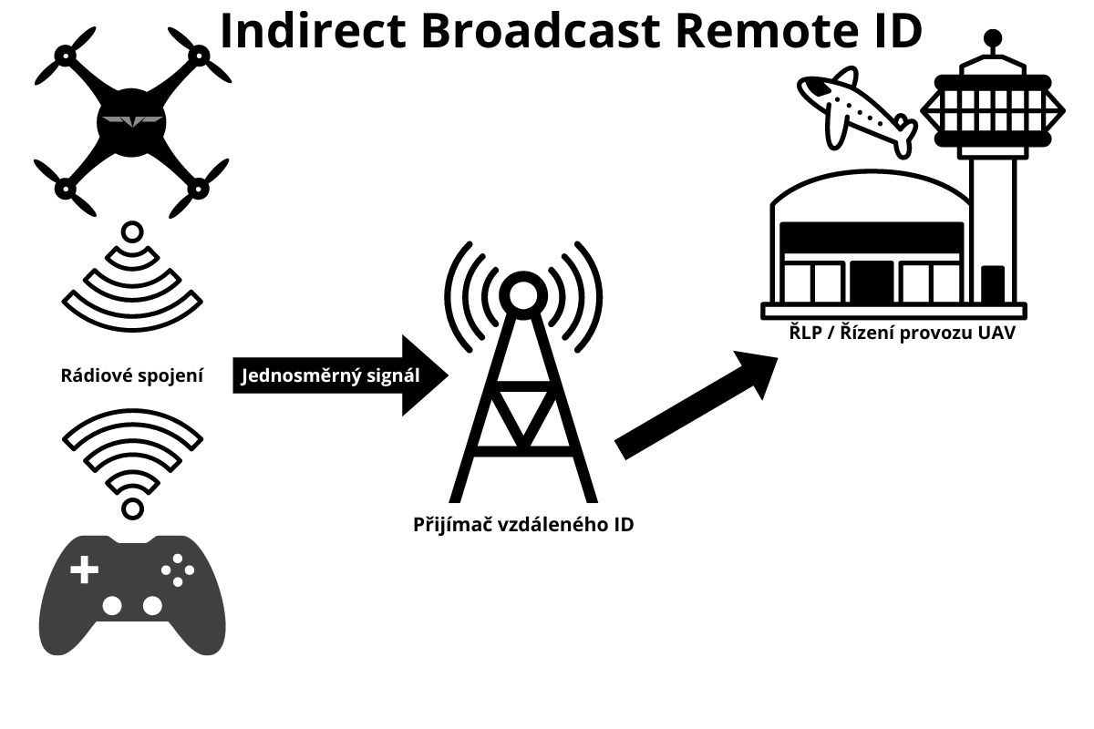 Dalším způsobem pro vzdálenou identifikaci je Indirect Broadcast Remote ID. Dron v tomto případě neposílá údaje přímo pro potřeby vzdálené identifikace. Důležitým aspektem celého systému je zde přijímač vzdáleného ID, který se také nazývá sniffer, jenž zprostředkovává spojení mezi dronem, pilotem a UAT.